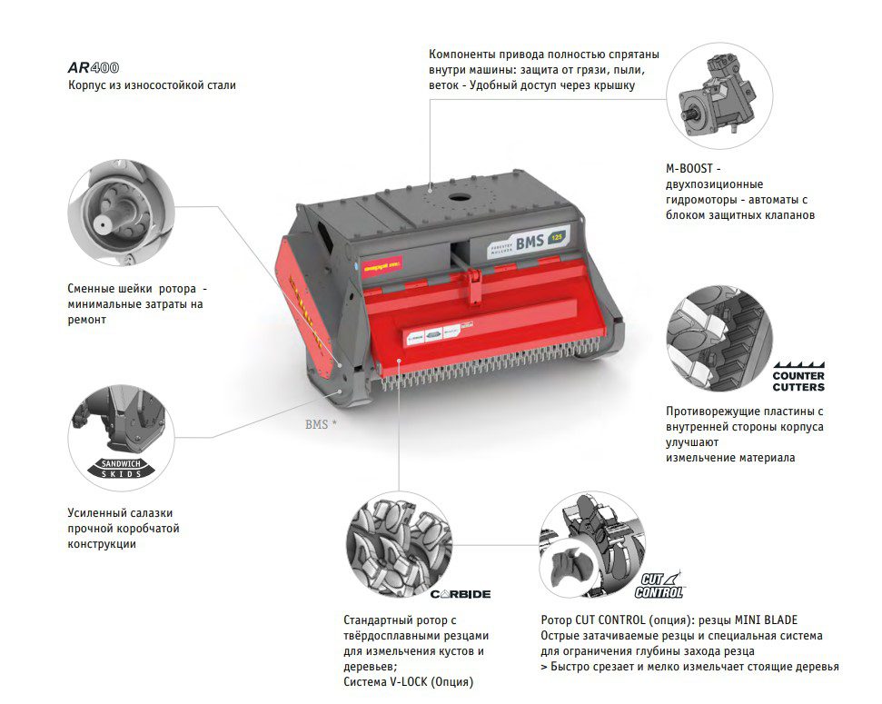 Мульчер BMS комплектуется двумя вариантами гидромоторов M-BOOST с рабочим объёмом 60-80 см.3, или 110-160см3 в зависимости от гидравлической мощности экскаватора. При возрастании нагрузки гидромотор M-BOOST переключается с меньшего рабочего объёма на больший, повышая таким образом крутящий момент.