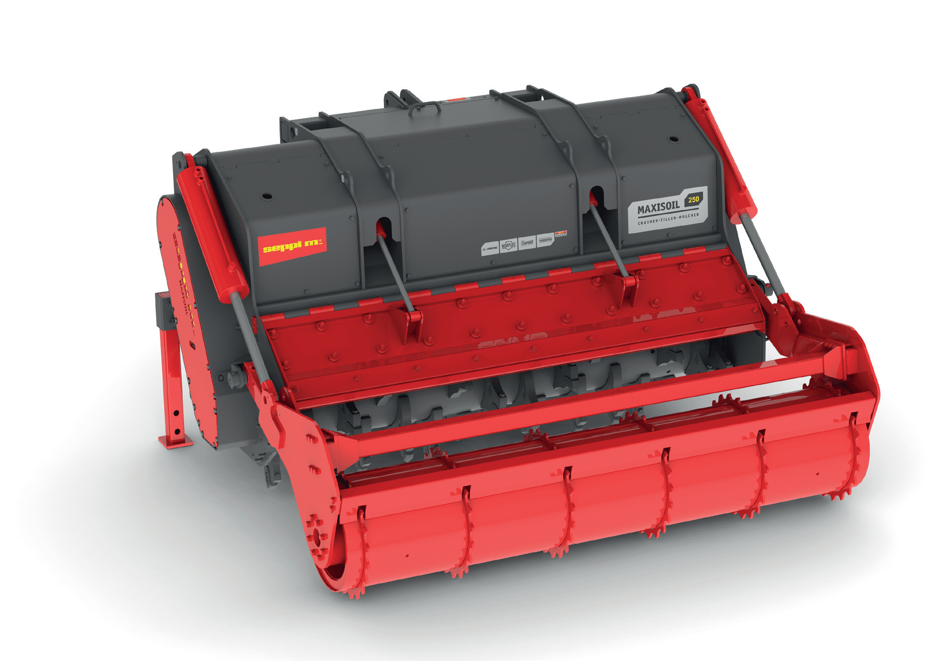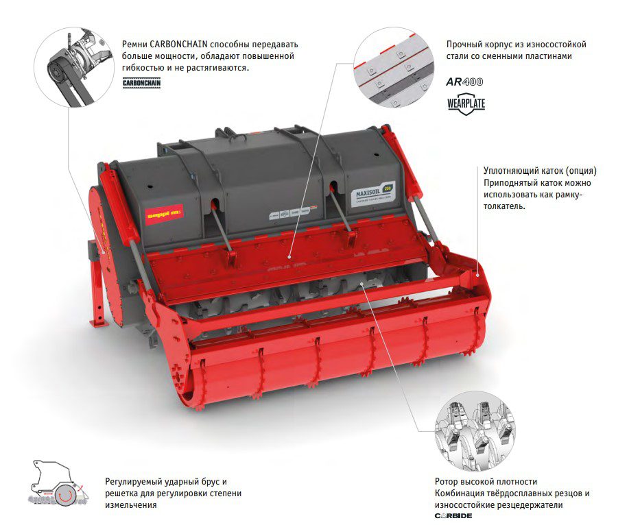 Ротоватор SEPPI MAXISOIL подходит для тракторов мощностью от 300 до 450 л.с. Запатентованный роторный V-LOCK имеет оптимизированную комбинацию новых жёсткозакреплённых молотков ULTRA MONO PROTECT + MONO и ULTRA MONO EXTREME со вставками из карбида вольфрама. В стандартной комплектации машина оснащена системой охлаждения трансмиссии, интегрированной с устройством дистанционного контроля температуры, что исключает риск перегрева трансмиссии в случае прерывания работы. Зубчатые ремни CARBONCHAIN обеспечивают высокую прочность и стабильность. Рама полностью защищена сменными износостойкими пластинами Hardox ® . В стандартной версии установлена система минимизации рабочих углов карданного вала ADAM, улучшающая адаптацию машины к почве. Эта функция «угловой компенсации» SEPPI используется для защиты карданного вала, ВОМ трактора и MAXISOIL от ненужных нагрузок, вызванных перепадами в почве. MAXISOIL в базе имеет регулируемый ударный брус регулируемый капот для получения желаемой степени измельчения.